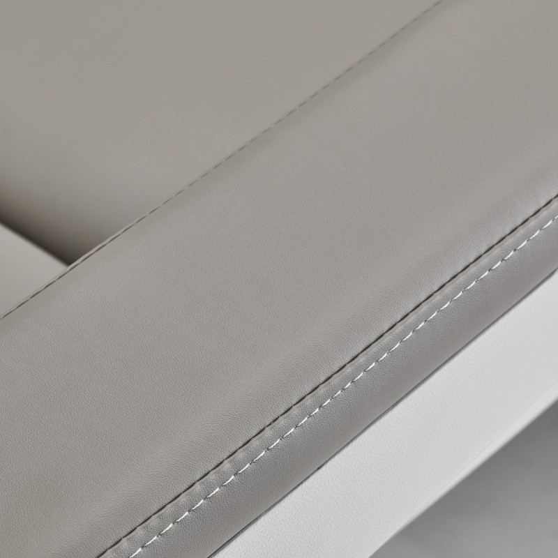 Stolica je ispunjena pjenom odgovarajuće tvrdoće i presvučena ugodnom imitacijom kože u sivim nijansama. Zahvaljujući korištenju materijala koji se lako održava čistim i otporan je na odabrana dezinficijensa , oprema je udobna za korištenje, otporna na vlagu i jednostavna za čišćenje. Čvrsta baza izrađena od izdržljivog bijelog materijala osigurava stabilnost tijekom tretmana. Pravilno profilirani rubovi daju stolici elegantan izgled i čine sjedalo ergonomskim .