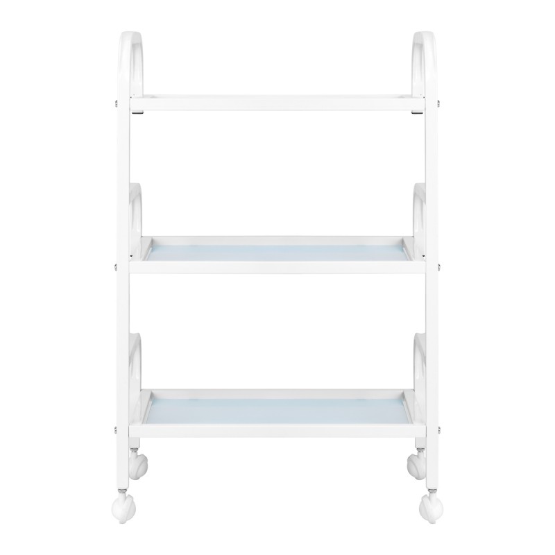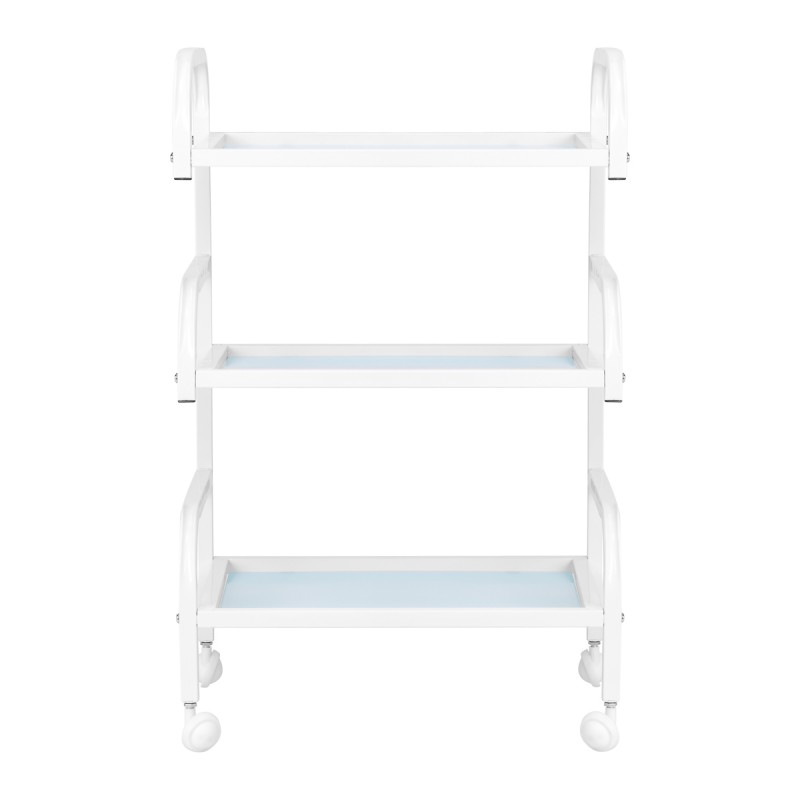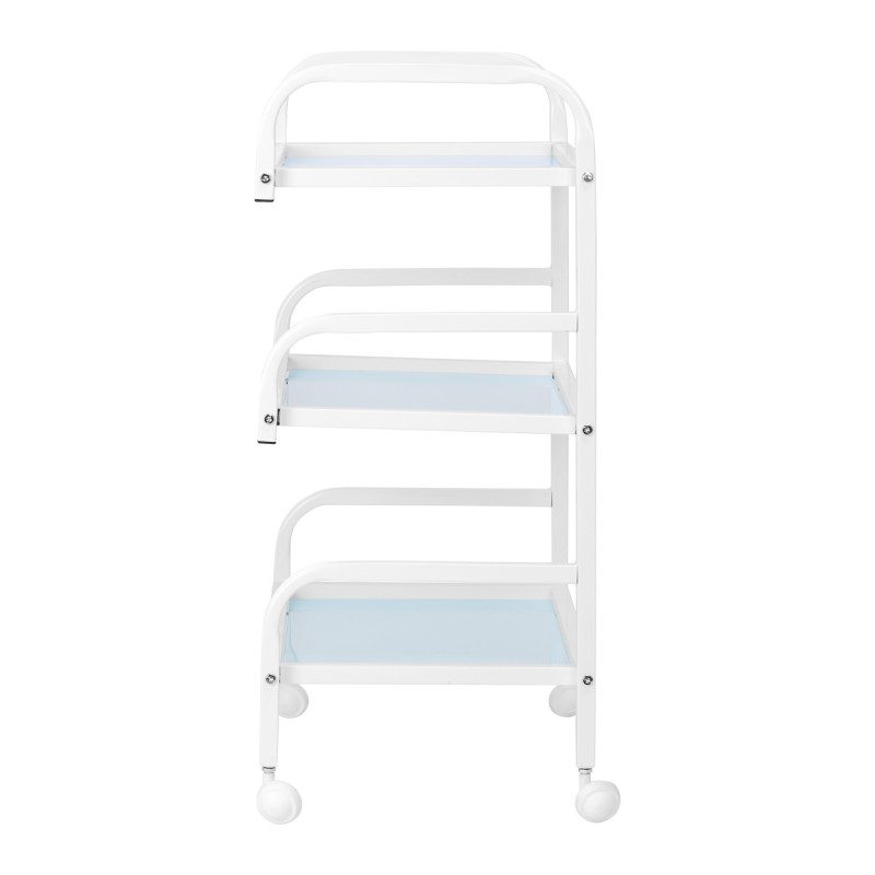 The frame made of durable aluminum in shades of white and the glass shelves create a modern and aesthetic whole that is easy to keep clean. Four wheels ensure mobility for easy organisation of the workspace, while solid materials guarantee stability and durability of use.
