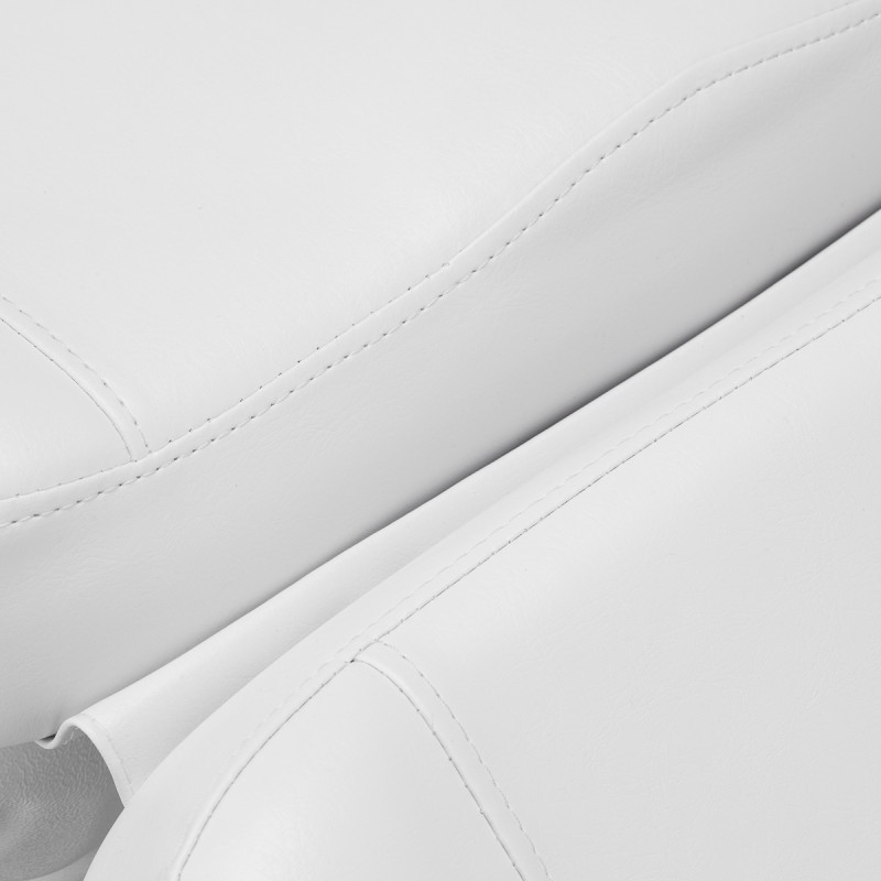 Stolica je ispunjena konturnom pjenom i prekrivena ugodnom sintetičkom kožom u bijelim nijansama. Korišteni materijal olakšava čišćenje opreme, kao i otpornost na vlagu i odabrana dezinficijensa . Čvrsta baza izrađena od izdržljivog bijelog materijala osigurava stabilnost tijekom tretmana. Pravilno profilirani rubovi daju stolici elegantan izgled i čine sjedalo ergonomskim. Minimalistički, jednostavan dizajn i klasične boje omogućuju joj da se uklopi u svaki interijer.