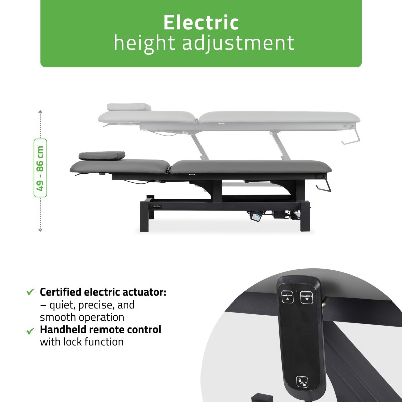 Električno podešavanje visine: Stol za masažu Fortis 2 opremljen je tihim, certificiranim električnim aktuatorom koji omogućuje precizno podešavanje visine od 49 cm do 86 cm, osiguravajući udobnost za terapeuta i praktičnost za pacijenta.