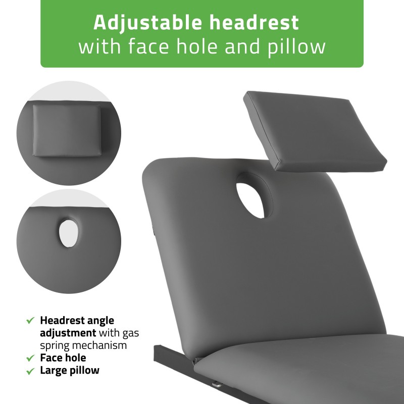 Podesivi naslon za leđa s otvorom za lice i jastukom za glavu: Kut nagiba naslona za leđa je podesiv, a mehanizam s plinskom oprugom osigurava tiho i precizno pozicioniranje pacijenta prema potrebama terapije. Otvor za lice na stolu omogućuje slobodno disanje u "ležećem" položaju. Veliki jastuk prekriva otvor kada je potrebno, pružajući udobnost pacijentu u "ležećem" ili bočnom položaju.