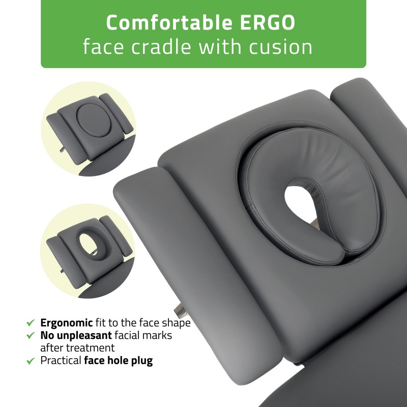 Naslon za glavu s ERGO jastukom: Kut naslona za glavu podesiv je prema potrebama terapije. ERGO jastuk je mekan, udoban, posebno oblikovan i prilagođen obliku lica, osiguravajući izvrsnu udobnost za pacijenta čak i tijekom dugih tretmana ili masaža.