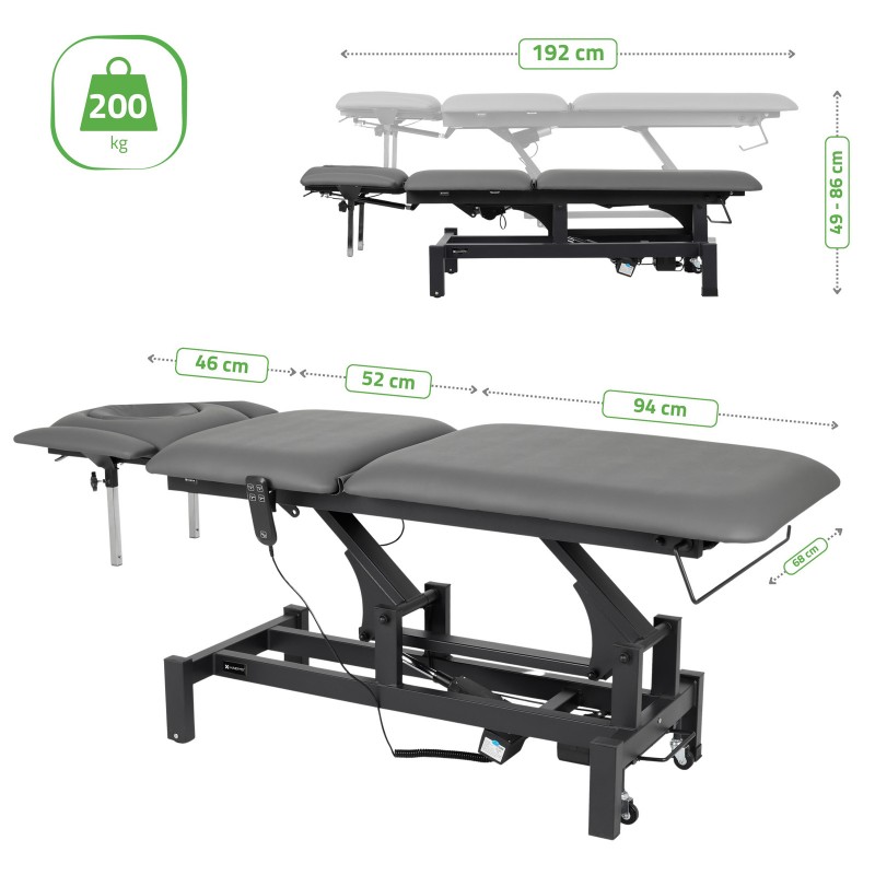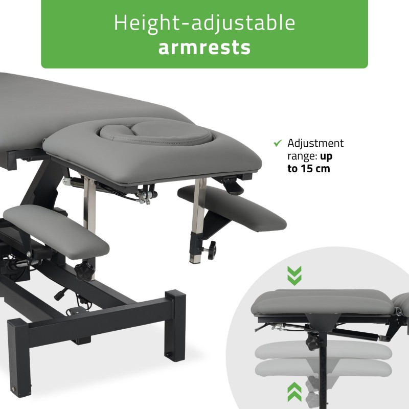 5-segmentna ploča stola: Ploča stola, dimenzija 192 cm x 68 cm, sastoji se od pet segmenata, što omogućuje precizno podešavanje prema potrebama pacijenta. Naslon za glavu, nasloni za ruke i oslonac za noge podesivi su za optimalno pozicioniranje pacijenta, što je ključno tijekom manualne terapije i masaže.