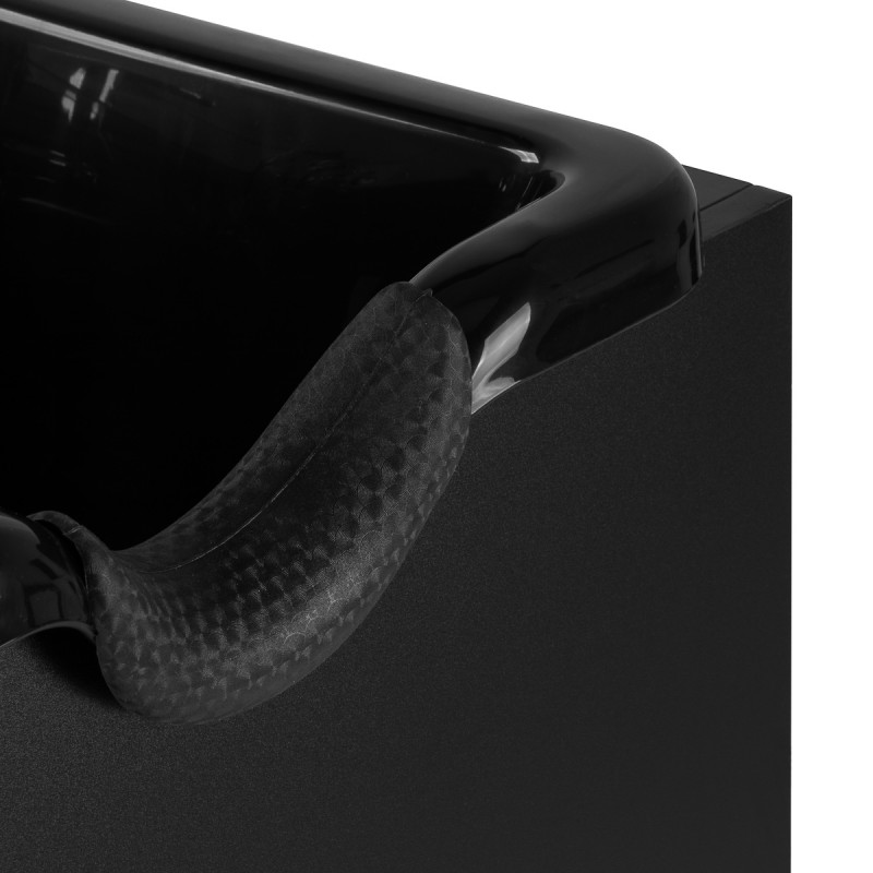 The deep black bowl is made of durable plastic, which makes it resistant to damage and easy to keep clean. Its well-thought-out design effectively reduces splashing of water and preparations during washing. The ergonomic shape and profiled collar with a silicone cover provide the client with a comfortable head position. A practical place for the shower handset helps to better organize the station, and the plug with a strainer makes it easier to control the water flow and maintain cleanliness and hygiene.