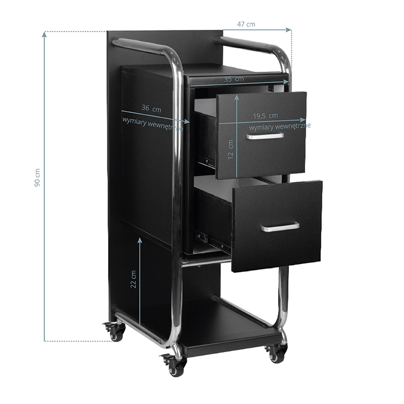 High-quality Gabbiano Solo hairdressing assistant is an elegant piece of equipment, which significantly improves work in the hairdressing salon. Two spacious drawers and two shelves of different sizes significantly facilitate the organization of products and necessary tools. Rubberized wheels with brakes ensure adequate mobility, which allows for place furniture anywhere in the hairdressing salon. Elegant design – polished metal elements in shades of silver and stable structure made of wooden boards in shades of black – will perfectly emphasize the character of the interiors.