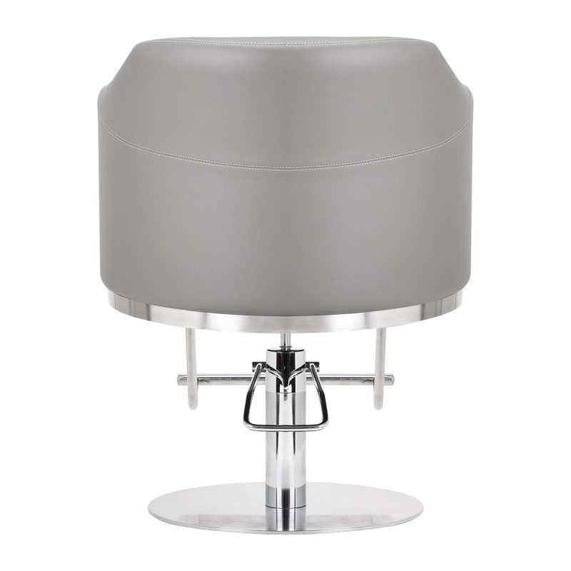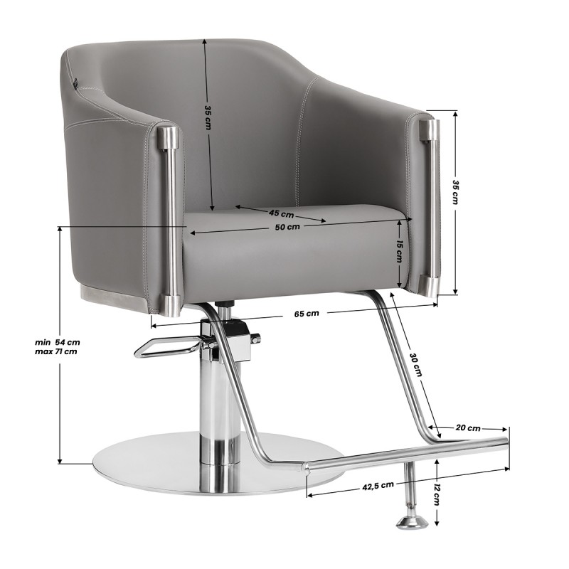 Čvrsta, okrugla baza osigurava stabilnost tijekom upotrebe. Glatka površina olakšava čišćenje ovog predmeta. Široko sjedalo, ispunjeno pjenom odgovarajuće čvrstoće, jamči visoku udobnost i praktičnost čak i tijekom dugotrajnih tretmana. Nasloni za ruke su na pravoj visini, što omogućuje pravilan položaj ramena klijenta - to znači da ne skriva glavu u rukama niti se pogrbljeno drži - što znatno poboljšava tretmane, uključujući šišanje. To olakšava precizno izvođenje usluga .