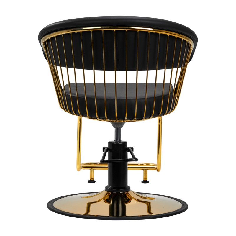 The durable hydraulic lift allows you to adjust the seat height within 48-55 cm, even when the customer is sitting on the chair. This guarantees more ergonomic work, thanks to the ability to freely adjust the level of the chair to the height of both the client and the hairdresser and the option of full rotation. The perfectly profiled backrest covered with synthetic leather allows you to take a comfortable position. This provides adequate support for the back, which is especially important for treatments lasting many hours. A visually interesting element here is a metal, polished, sophisticated detail in shades of gold connecting the backrest with the seat. The spaces created make it easier to keep the salon clean, allowing you to easily sweep hair from every nook and cranny of the chair. This saves time preparing the workstation between clients.