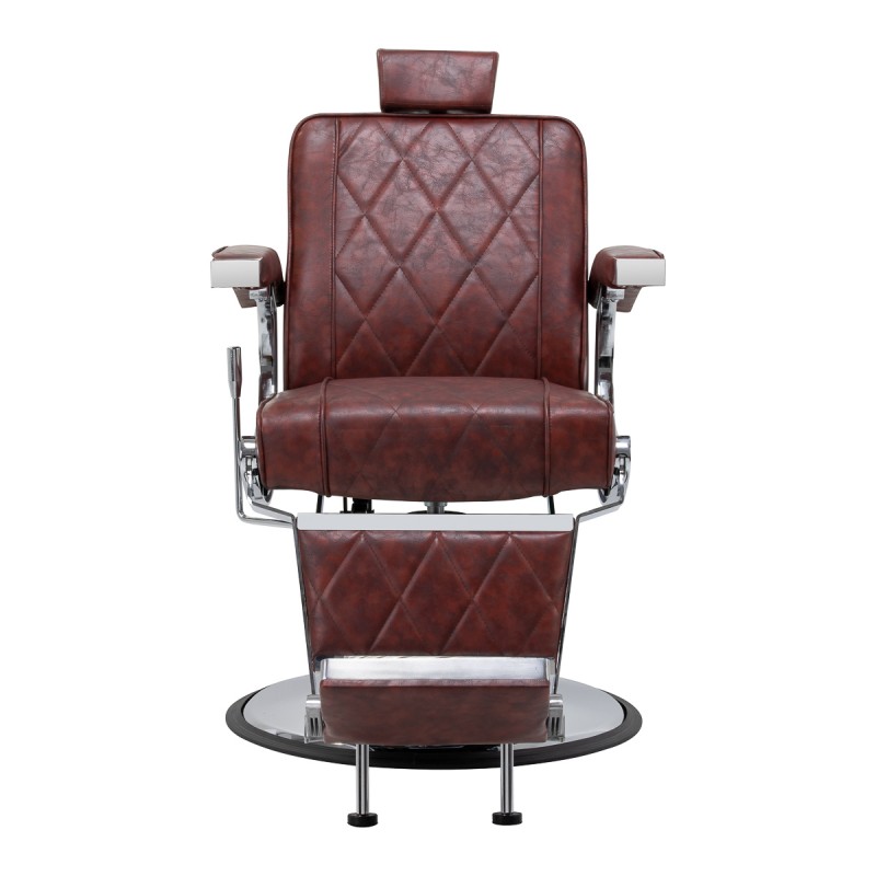 The chair's solid round base construction ensures stability and excellent user comfort. The seat filling, made of deformation-resistant foam, and the upholstery crafted from soft-touch synthetic leather with a matte finish ensure long-lasting durability and comfort during prolonged use. Stylish stitching on the upholstery adds character, evoking automotive design inspirations that enhance its elegant appearance. This feature also makes the chair moisture-resistant, durable, and easy to clean. The upholstery in burgundy tones gives the chair a unique character, and its minimalist style allows it to blend seamlessly with the decor of any barbershop.