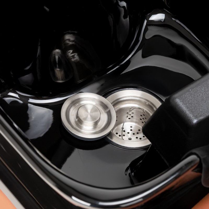 Keramička zdjela u nijansama crne boje, sa svojim modernim oblikom i odgovarajućom dubinom, učinkovito sprječava prskanje vode i proizvoda koji se koriste tijekom tretmana, omogućujući udobno i učinkovito pružanje širokog spektra usluga. Pravilno oblikovan ovratnik i nagnuto naslon za glavu osiguravaju udobnost i potporu tijekom pranja kose, dok crni plastični poklopac štiti klijenta od hladne keramičke površine, osiguravajući ugodno iskustvo tijekom tretmana.