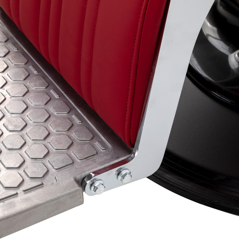 Stabilna baza pruža sigurnu potporu i visoku udobnost pri korištenju. Sjedalo je ispunjeno pjenom otpornom na deformacije i presvučeno polumatalom sintetičkom kožom, što jamči dugotrajnost i udobnost. Materijali se odlikuju otpornošću na vlagu i jednostavnošću čišćenja. Bordo presvlaka u kombinaciji s metalnim kromiranim elementima i ukrasnim naslonom za noge daju stolici jedinstven, klasičan karakter. Vertikalno šivanje naglašava vintage stil, koji se savršeno uklapa u atmosferu profesionalnih brijačnica. Pažljivo profinjeni detalji daju cjelini reprezentativan izgled, a funkcionalan dizajn potiče udoban i učinkovit rad.