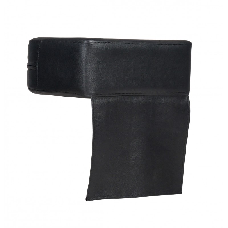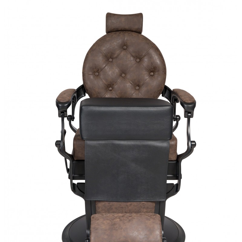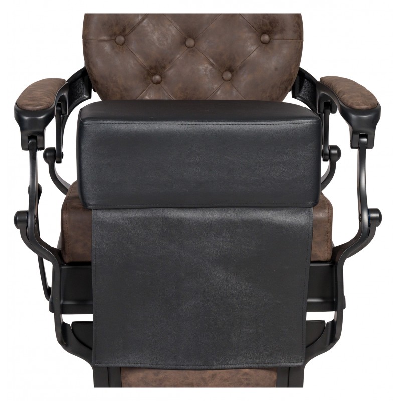 Stolica za brijača je crna, čvrsta i elegantnog dizajna. Ima metalni okvir s naslonima za ruke i pod..