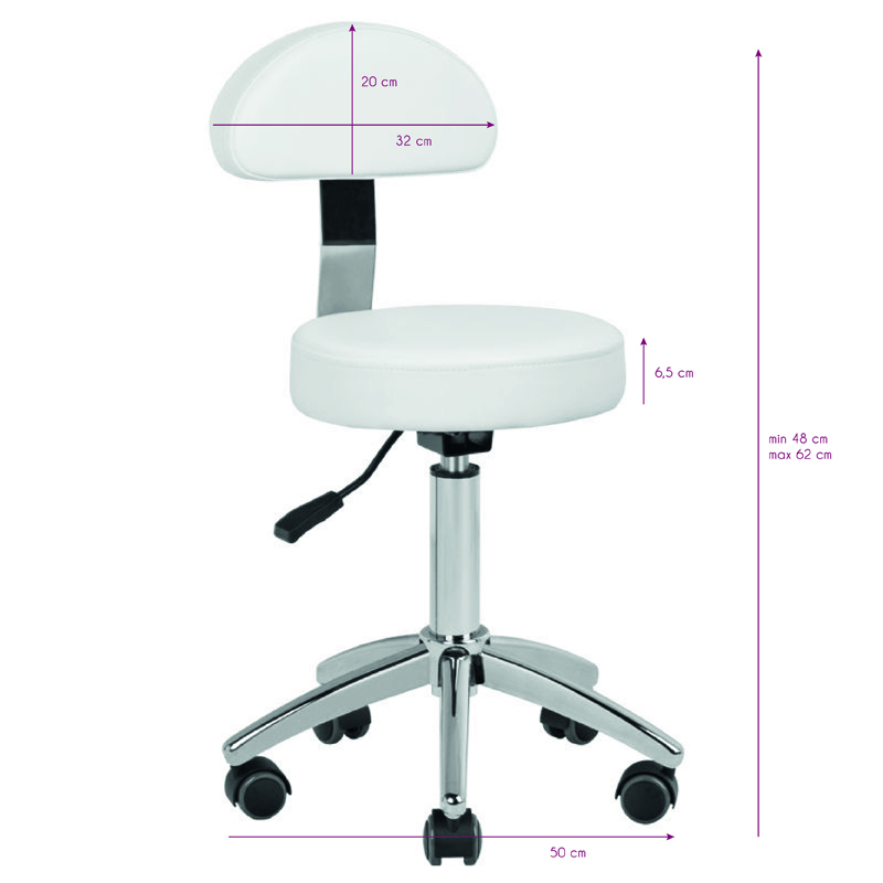 udobna kozmetička stolica, stabilna na petozvjezdastoj podlozi, s gumiranim kotačima, s mogućnošću rastavljanja naslona, bijela, neophodan komad namještaja u kozmetičkom salonu.
