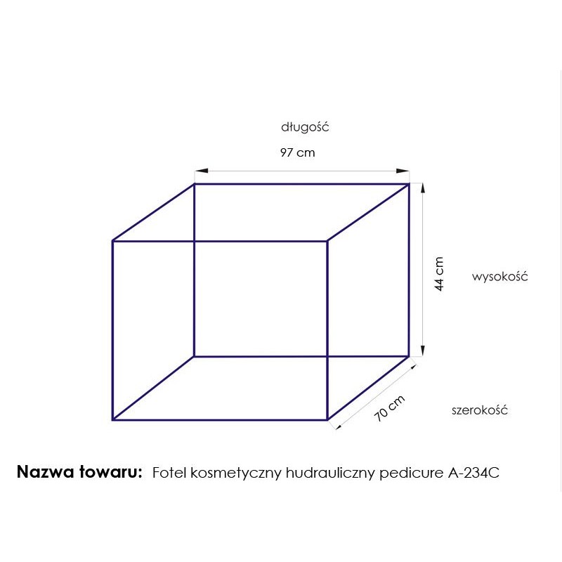 Okretna stolica s blokadom, s podijeljenim osloncima za noge, hidraulički se podiže i spušta, s rupom u naslonu za glavu, idealna za kozmetiku, pedikuru, šminkanje i masažu. Ima uklonjive naslone za ruke i utikač u naslonu za glavu. Navlaka sjedala koja se lako pere, izrađena od eko kože, zadovoljava stroge EU zahtjeve, estetski je estetika, poniklani metalni elementi. Fotelja je dostupna u bijeloj boji.