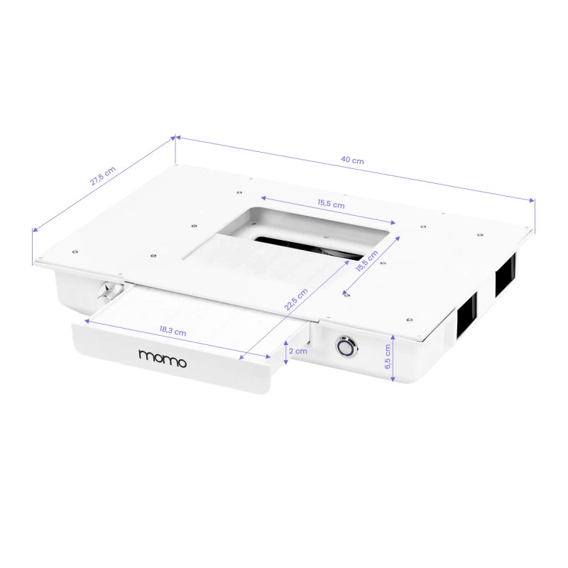 The Momo J-02 cassette dust collector built into the countertop significantly improves the udobnost and hygiene of work, effectively removing dust generated during beauty treatments, such as manicures. Thanks to this device, the air in the salon remains clean and the workplace free from pollution, which increases the safety of both the beautician and clients. The dust collector is easy to use and maintain, which additionally enhances its functionality. Regular cleaning and filter replacement ensure consistently high absorption efficiency. It is possible to purchase additional replacement filters (SKU 123581).