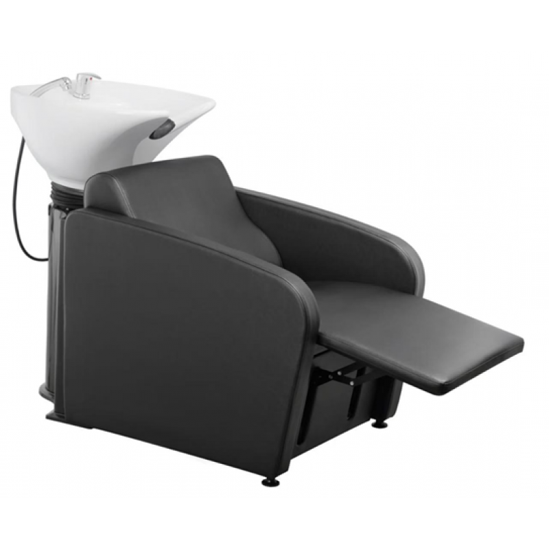 Stolica za brijača je crna, čvrsta i elegantnog dizajna. Ima metalni okvir s naslonima za ruke i pod..