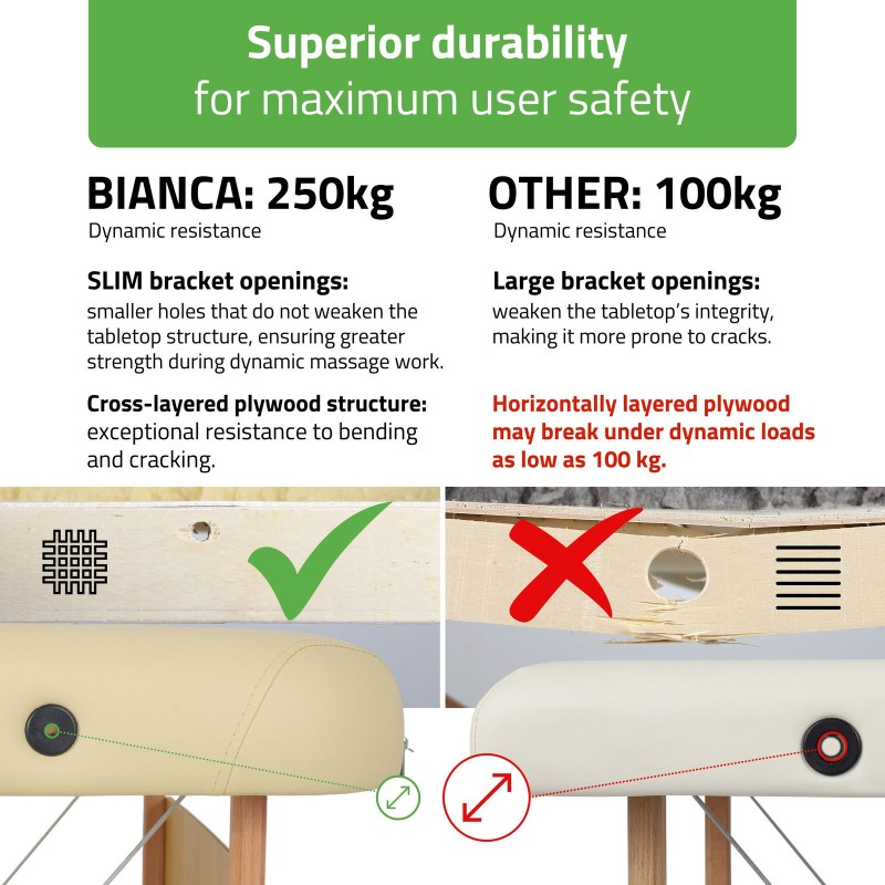 Bianca ima izdržljivu drvenu konstrukciju, udobnu pjenu debljine 5 cm i presvlaku otpornu na habanje. Zaobljeni kutovi poboljšavaju sigurnost i estetiku, dok trodijelna ploča stola proširuje mogućnosti pozicioniranja pacijenta tijekom raznih tehnika masaže, terapija i SPA tretmana.