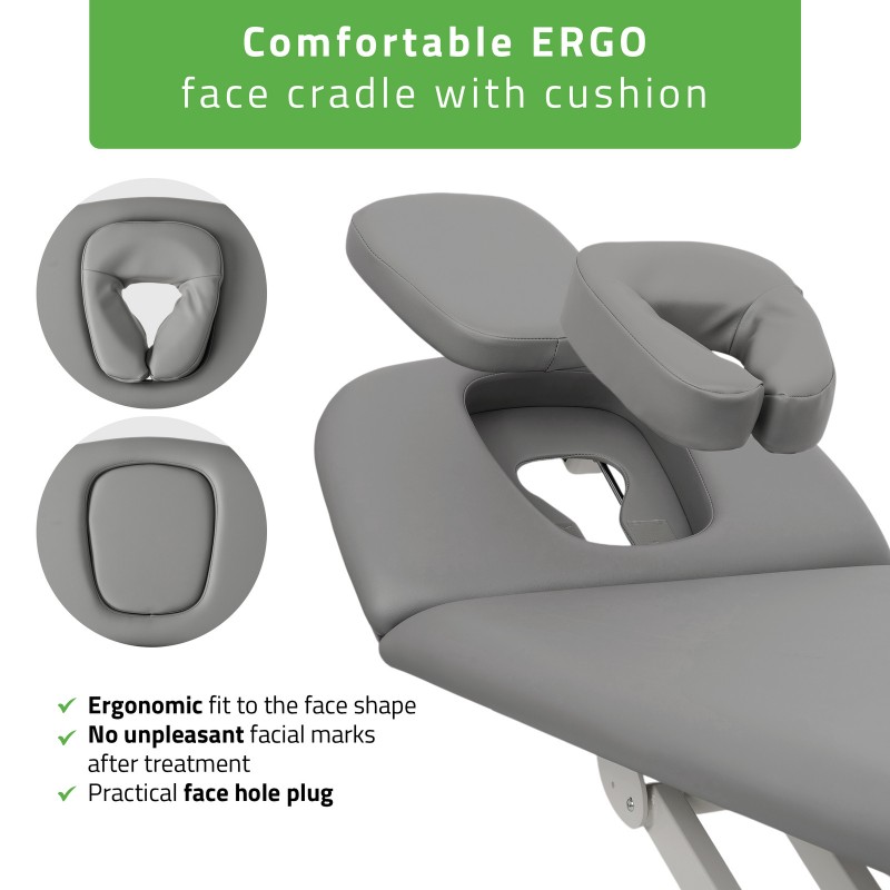 Podesivi naslon za glavu s otvorom za lice i ERGO jastukom: Osigurava udobnost za pacijente i u ležećem i u trbušnom položaju tijekom dugih i intenzivnih tretmana. Podešavanje plinske opruge omogućuje raspon kuta od -70° do +40°.