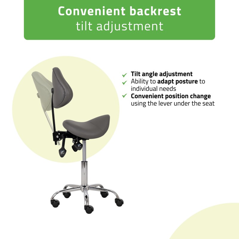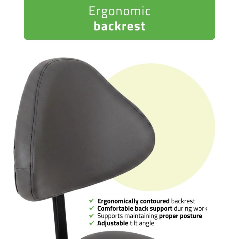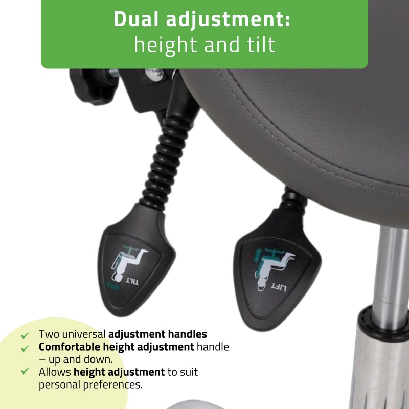 The combination of a saddle-shaped seat and an ergonomic backrest supports natural body alignment and helps maintain an upright posture. This reduces strain on the lumbar spine and enables more efficient work during procedures that require precision.