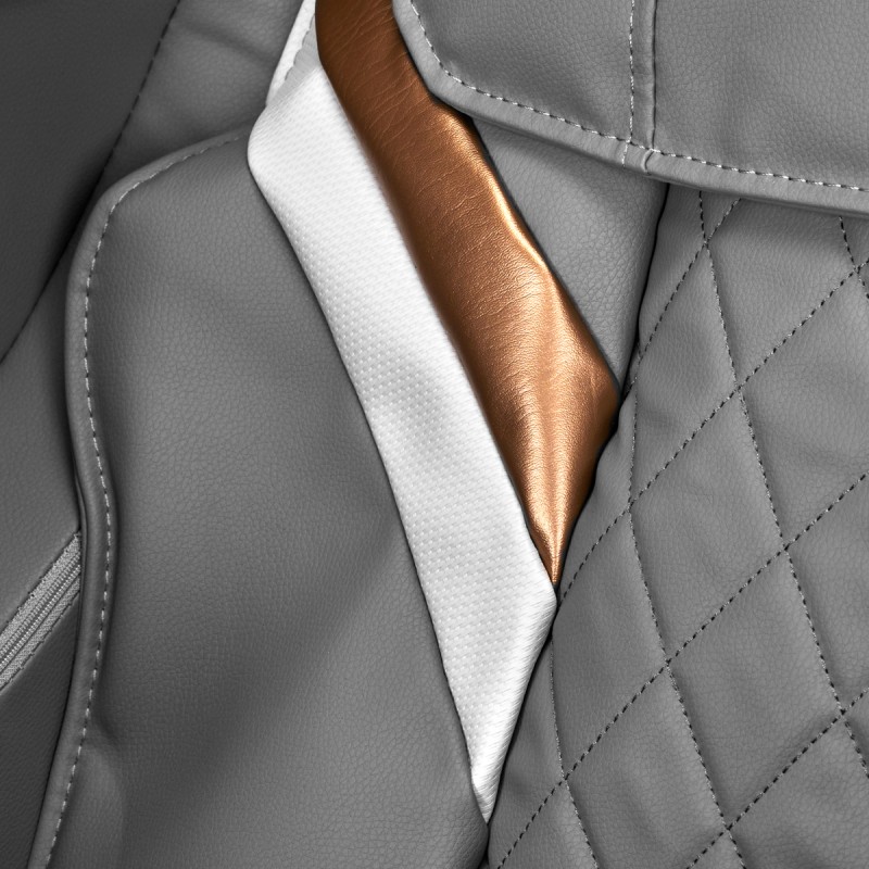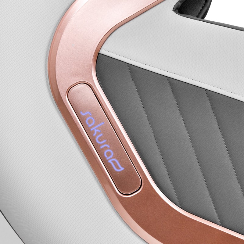 Udobna unutrašnjost stolice prekrivena je ugodnom imitacijom kože u sivim tonovima. Korištenje takvog materijala čini je vrlo otpornom na vlagu i lakom za čišćenje . Bijeli i sivi materijali korišteni na vanjskim dijelovima stolice i ukrasni element boje ružičastog zlata daju proizvodu karakterističan, elegantan izgled koji ga razlikuje od drugih. Pažljivo izrađeni rubovi daju joj moderan izgled, a čvrsta konstrukcija jamči dugotrajnu upotrebu. Kompaktni model s estetskom završnom obradom i klasičnom shemom boja savršeno će se uklopiti u svaki interijer. Masažna fotelja Sakura Classic 802A savršen je način za opuštanje u bilo kojem trenutku, posebno nakon napornog dana ili napornog treninga.